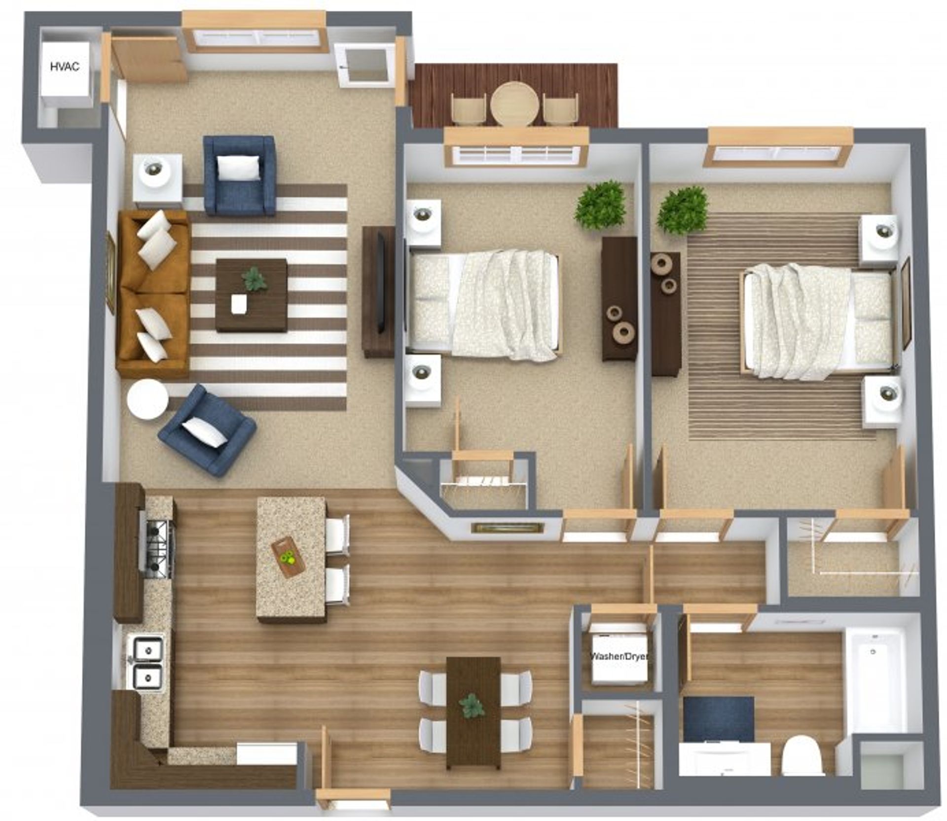2 bedroom/1 bath apartment with open concept living area, individual heating/cooling, in-unit washer/dryer, covered patio/balcony. Community room, public restroom, fitness room. Clubhouse: Site Manager’s office, lounge, conference room, restrooms, outdoor pool/showers.