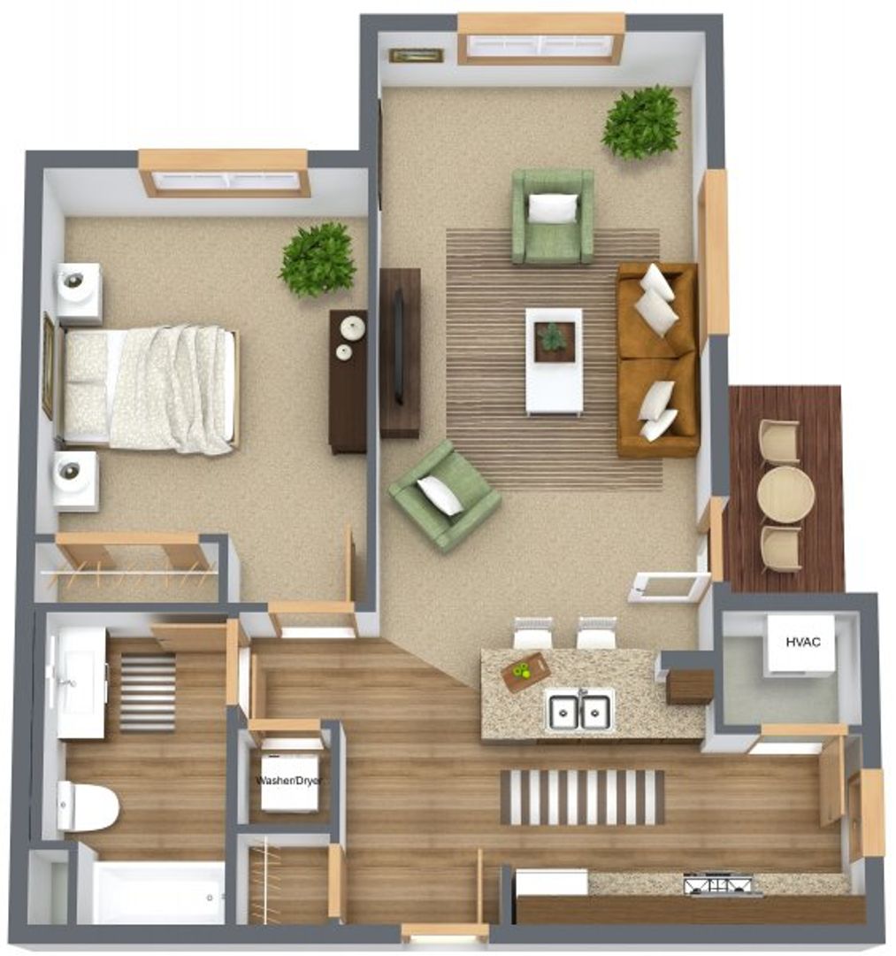 1 bedroom/1 bath apartment with open concept living area, individual heating/cooling, in-unit washer/dryer, covered patio/balcony. Community room, public restroom, fitness room, library/game room. Clubhouse: Site Manager’s office, lounge, conference room, restrooms, outdoor pool/pergola/showers.