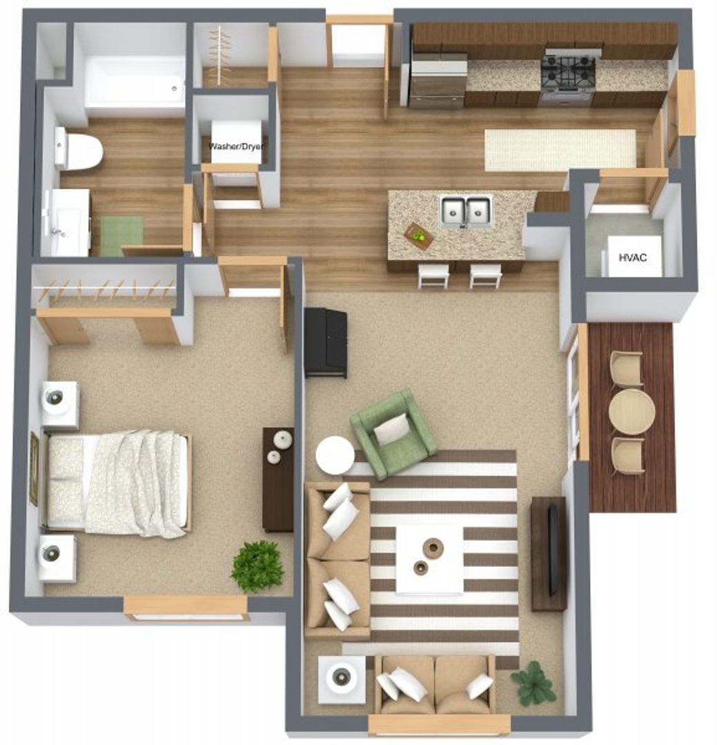 1 bedroom/1 bath apartment with open concept living area, individual heating/cooling, in-unit washer/dryer, covered patio/balcony. Community room, public restroom, fitness room, library/game room. Clubhouse: Site Manager’s office, lounge, conference room, restrooms, outdoor pool/pergola/showers.