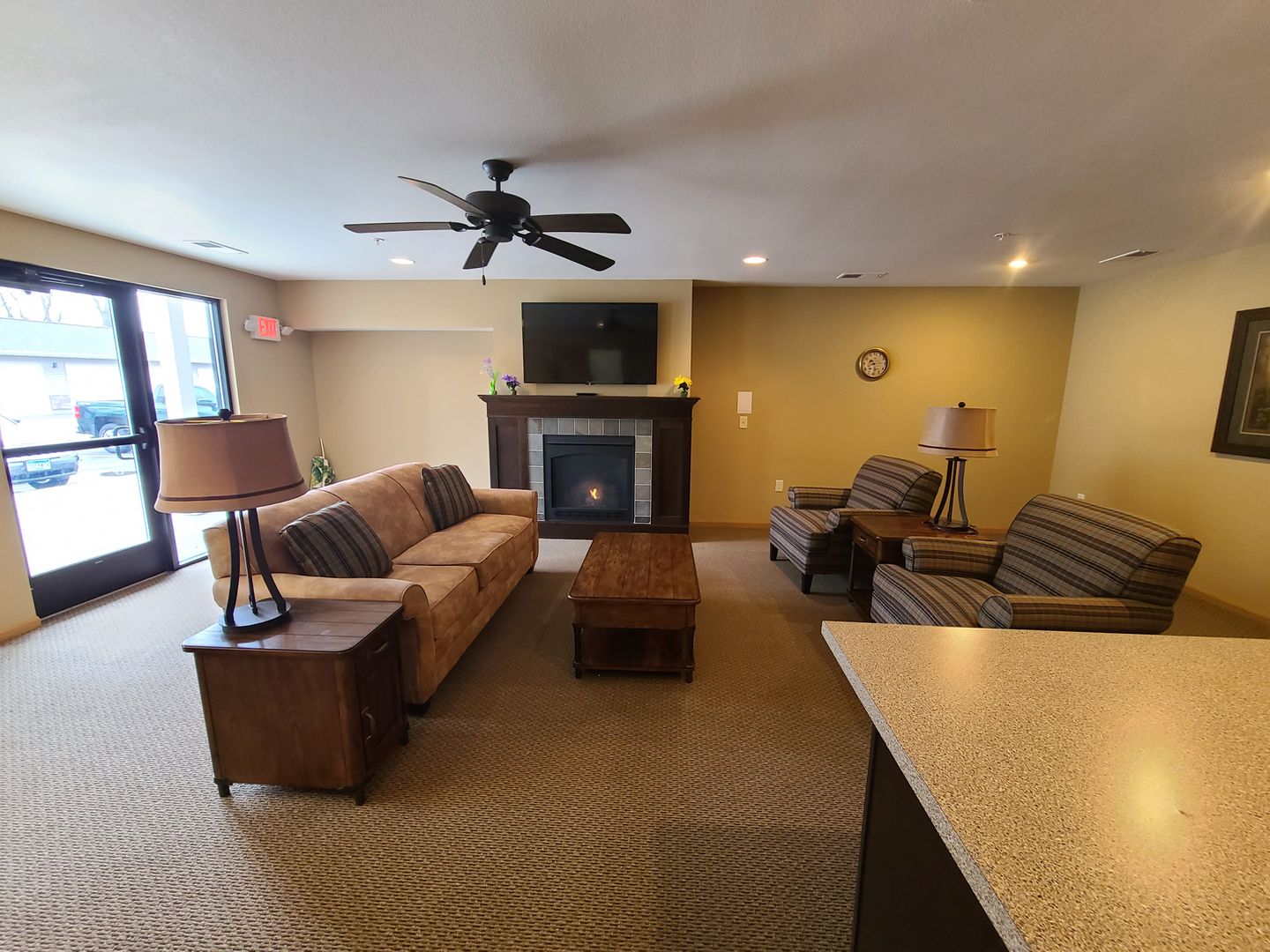 1 bedroom/1 bath apartment with open concept living area, hot water baseboard heat, individual air conditioning in each unit, and covered patio or balcony. Community rooms with public restrooms, library/game rooms, and well-equipped fitness rooms.