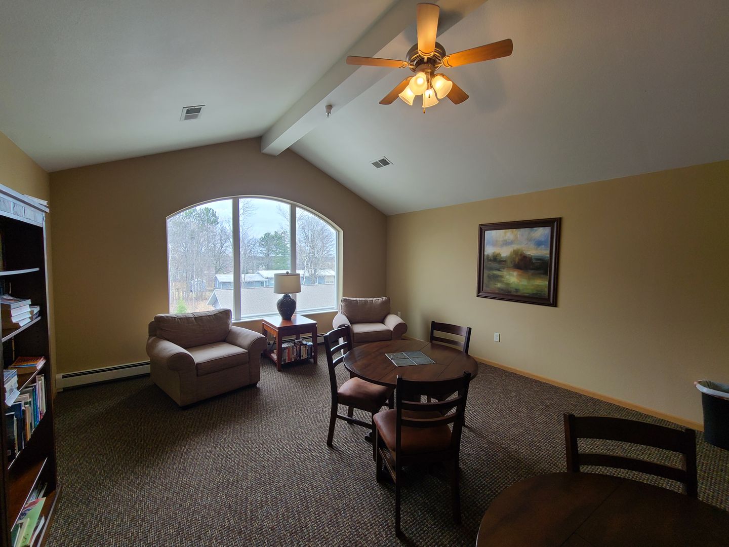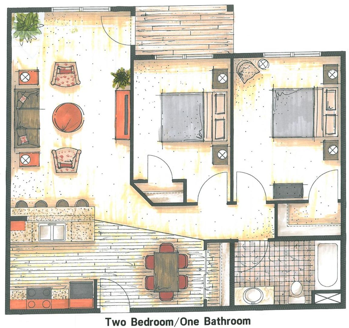 1 bedroom/1 bath apartment with open concept living area, hot water baseboard heat, individual air conditioning in each unit, and covered patio or balcony. Community rooms with public restrooms, library/game rooms, and well-equipped fitness rooms.