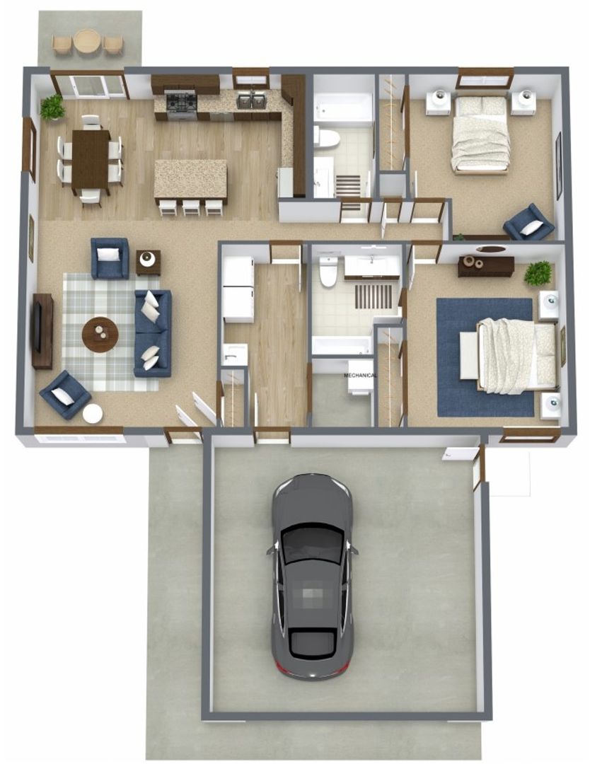 2 bedroom/2 bath patio home with open concept living area, laundry room (with washer & dryer), forced air heating/cooling, patio, and attached 2-stall garage. Includes lawn services and snow removal.