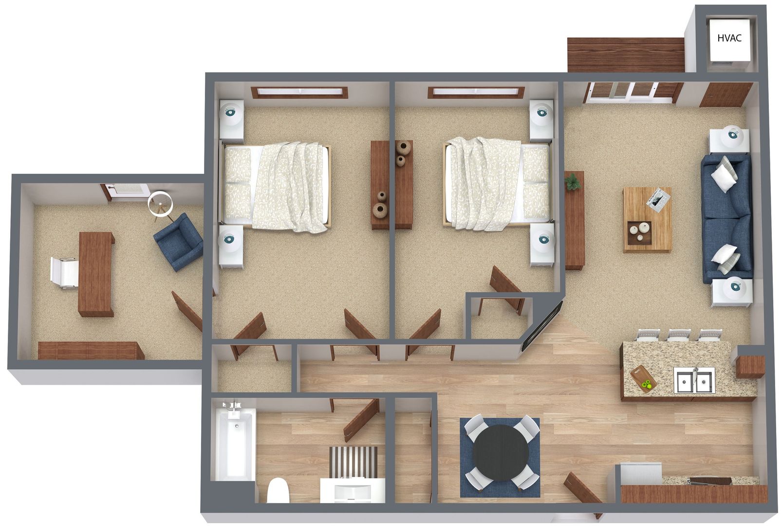 Located close to Digi-Key & Arctic Cat, 2 bedroom/1 bath/den apartment with open concept living area and individual heating/cooling system in each unit to maintain comfortable temperatures whatever the temperature. Each apartment has a covered patio or balcony. Community rooms with public restrooms and well-equipped fitness rooms.