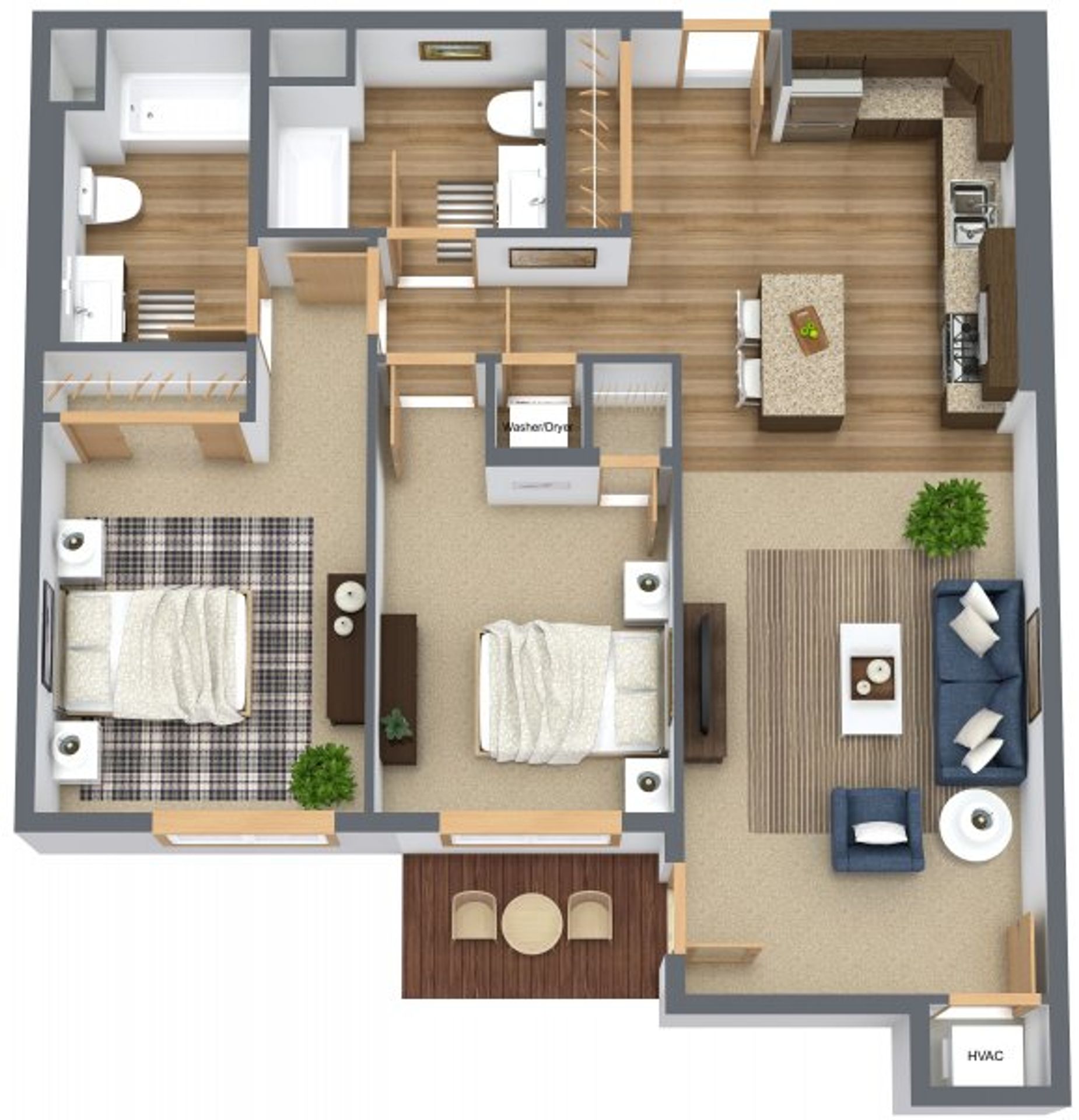2 bedroom/2 bath apartment with open concept living area, individual heating/cooling, in-unit washer/dryer, covered patio/balcony. Community room, public restroom, fitness room. Clubhouse: Site Manager’s office, lounge, conference room, restrooms, outdoor pool/showers.