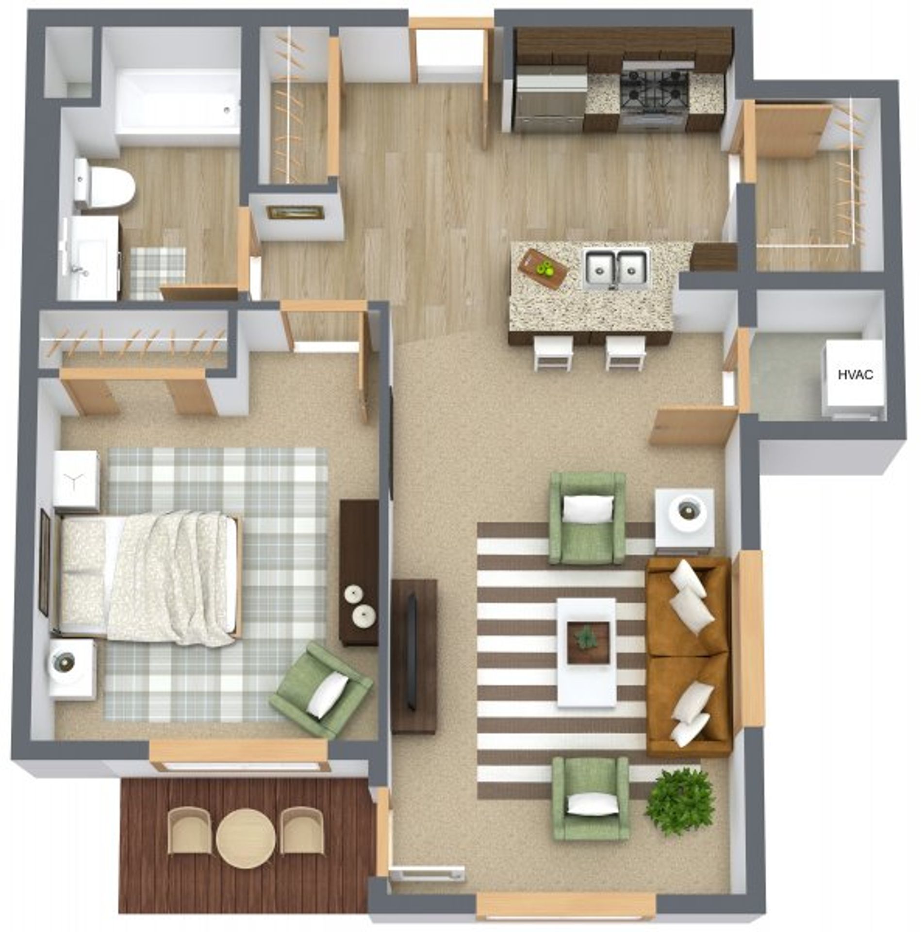 1 Bedroom/1 Bath Apartment/Pantry Apartment with open concept living area, individual heating/cooling system, and covered patio or balcony.
